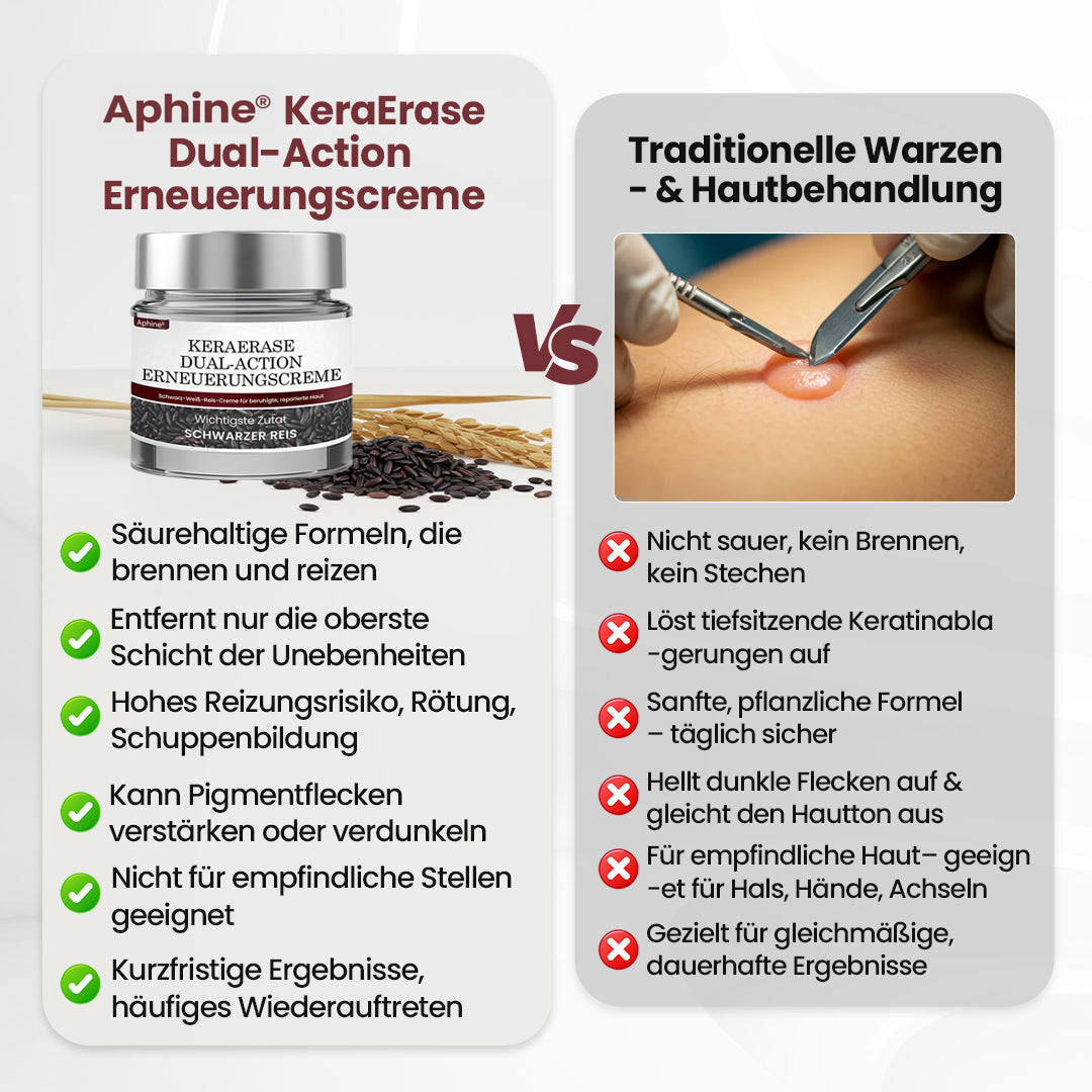 Deshalb haben wir Aphine® KeraErase Dual-Action Erneuerungscreme entwickelt – eine sanfte, pflanzenbasierte Formel, die erhabene Hautstellen weich macht, tief sitzende Keratinablagerungen abbaut und hartnäckige dunkle Stellen aufhellt – ganz ohne Säuren, Brennen, Schälen oder Irritationen.